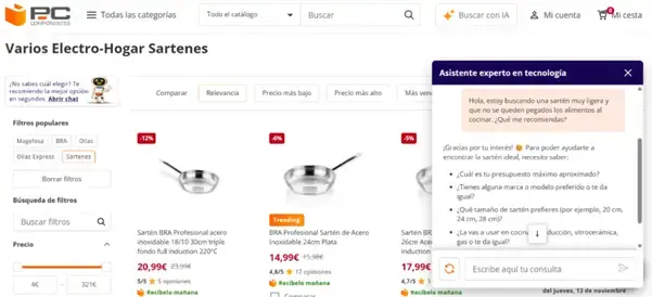 PcComponentes: ha integrado motores de recomendación y chatbots basados en IA que orientan al cliente durante la compra.